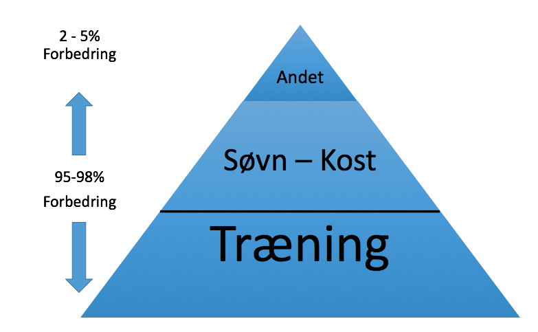 Hvis vi kigger på en simplificeret udgave af Team Danmarks model (6) for hvad der giver det bedste afkast af træning, så er der 3 ALTAFGØRENDE simple komponenter, nemlig træning, søvn og kost (se mere om kost og eSport her). Disse 3 hovedkomponenter er essentielle for al udvikling, om du er nybegynder eller på eliteniveau. Alle andre ting, som du måske har læst om på nettet, der kan gøre dig bedre, ligger i den resterende kategori på mulige 2-5%. Så hold fokus på det, som vi ved virker. Vi har en tendens til ofte at fokusere på de 2-5% også moderne kaldet "quick fixes". Vi tror ofte, at hvis vi får nyt udstyr (computer, mus, keyboard), så vil vi blive meget bedre. Men prøv at stil dig selv følgende spørgsmål; hvis du byttede udstyr med den bedste gamer du kan komme i tanke om, ville du så være lige så god som ham? Vil du kunne slå ham i direkte kamp? - Jeg tvivler. Har du ikke styr på det, som giver 95-98% af de forbedringer du ønsker, så glem alt om at kigge på de øvrige ting som "måske" kan have en lille effekt. Det virker lidt som at drikke proteinpulver i håbet om at få store muskler uden at styrketræne og svarer faktisk til at tisse i bukserne, når man fryser. Du får en meget lille effekt ud af det.