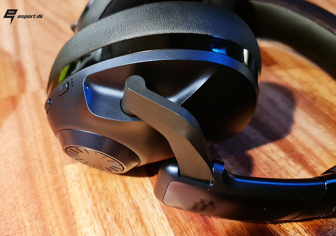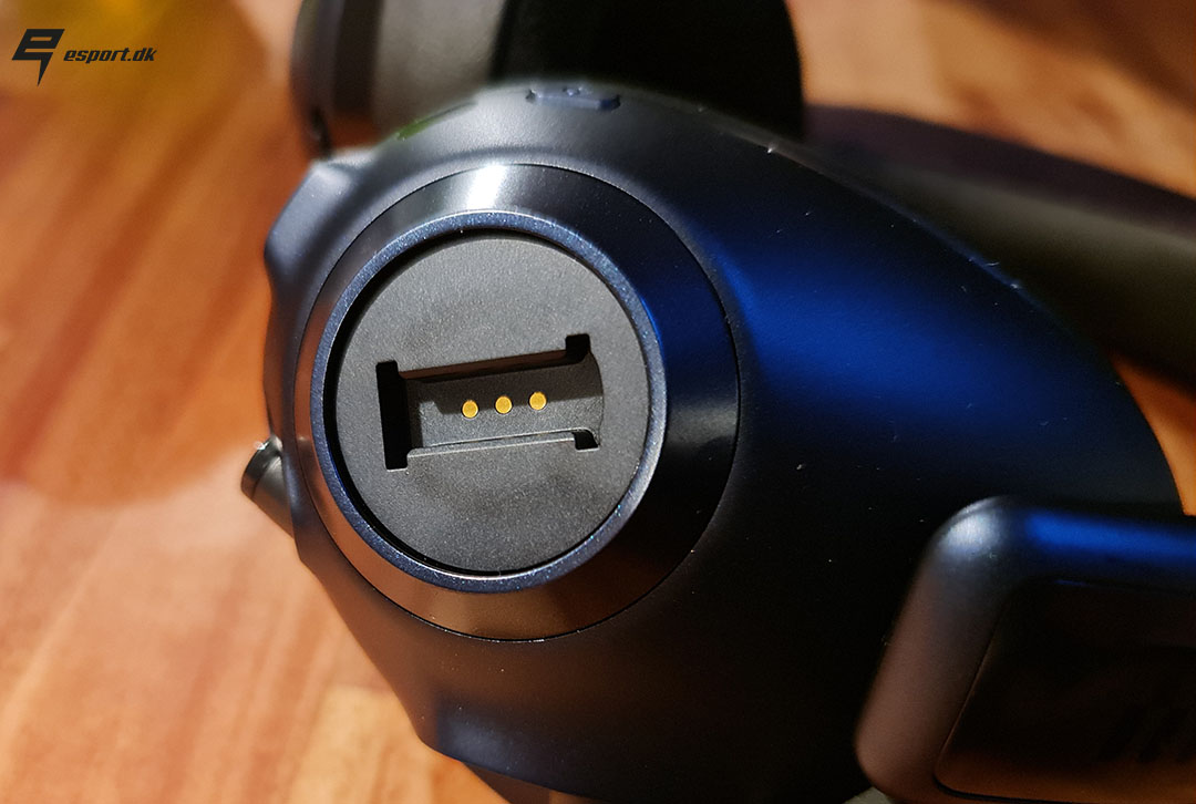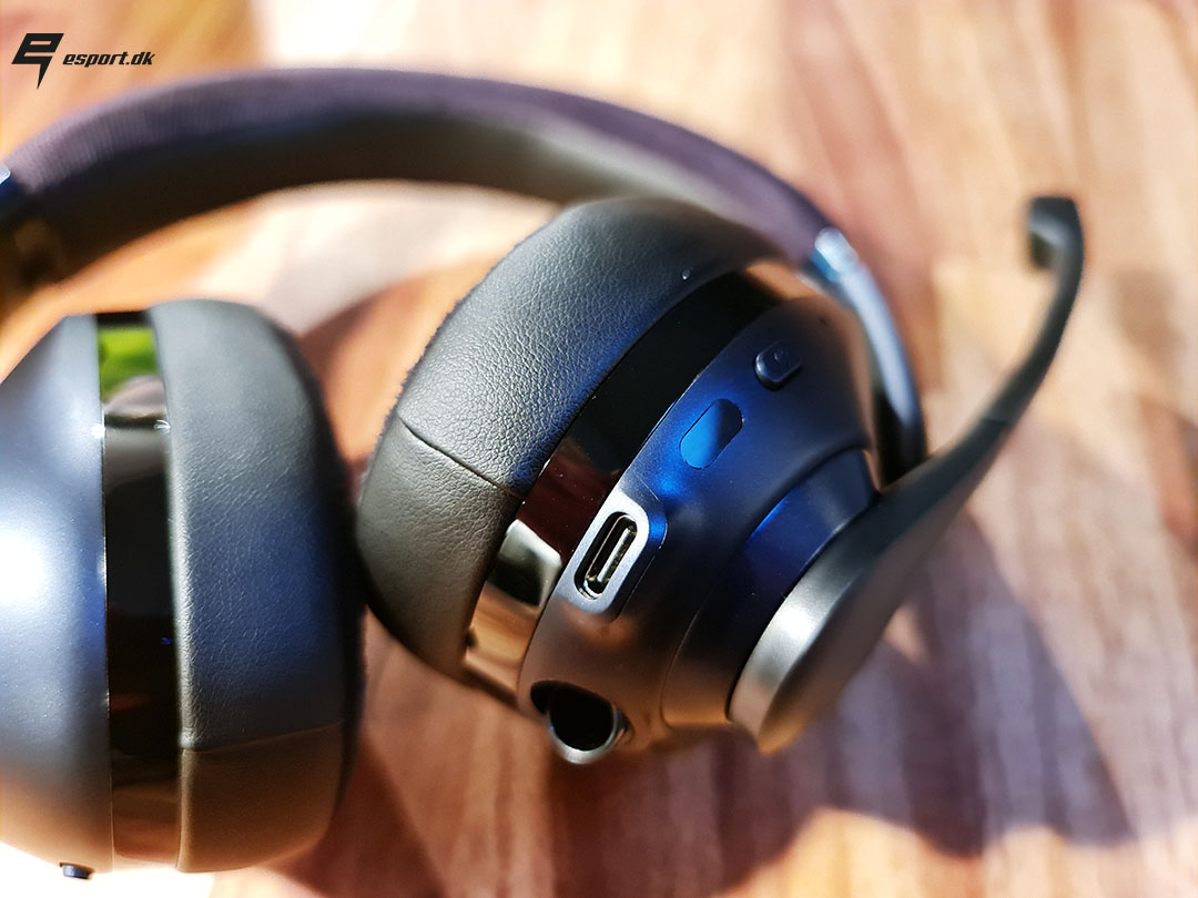 På venstre side af headsettet finder vi mulighed for at koble headsettet til via jackstik, hovedsageligt til folk med konsoller. Derudover finder vi ladestik, tænd/sluk knap samt LED indikator til strøm niveau.