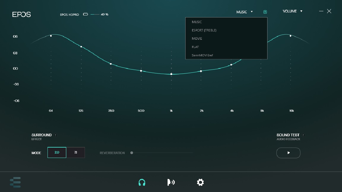 Du har mulighed for at vælge diverse predefineret settings afhængig af om du skal game, høre musik, se film eller andet. Det er også her du finder indstillingen til om du vil game i stereo eller surround.