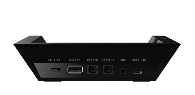 På bagsiden finder vi hvad der skal være for at et headset fungerer. Udover optisk ind/udgang, så er der AUX stik og micro USB stik samt knap til at skifte imellem om headsettet er sat til PlayStation eller PC.