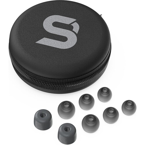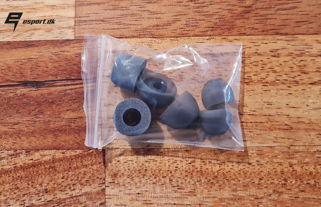 Der følger lidt forskellige “tips” med, den del der sidder i selv øret. Det er muligt at skifte til forskellige størrelser samt der er et sæt i skum.