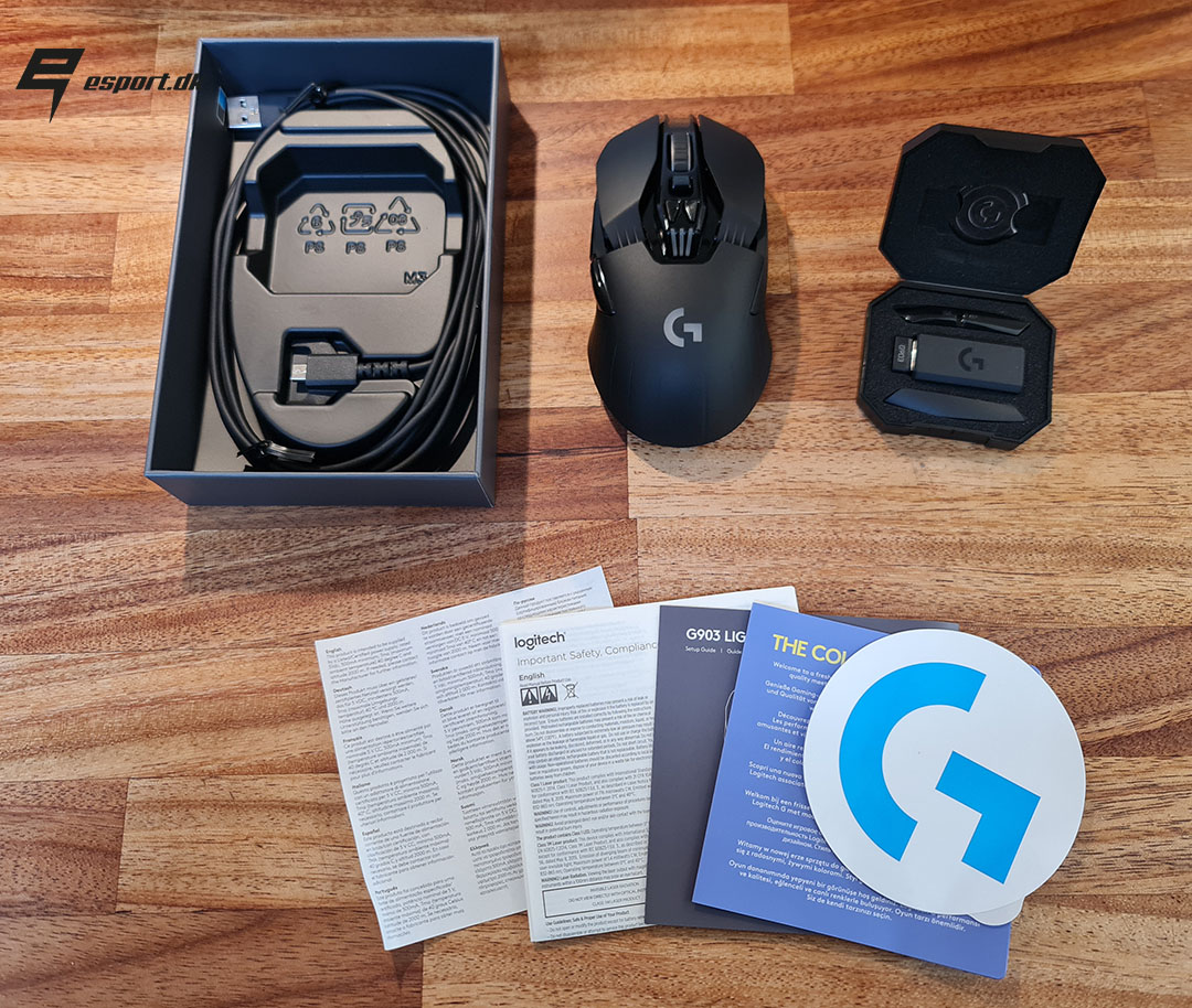 Logitech G903’eren ankommer i en flot lille glat papkasse, hvor låget sidder helt tæt sådan at kassen glider ud af bunden ved åbningen. Allerede her føles det som om der er kælet for detaljerne omkring denne mus, med kvaliteten af indpakningen.