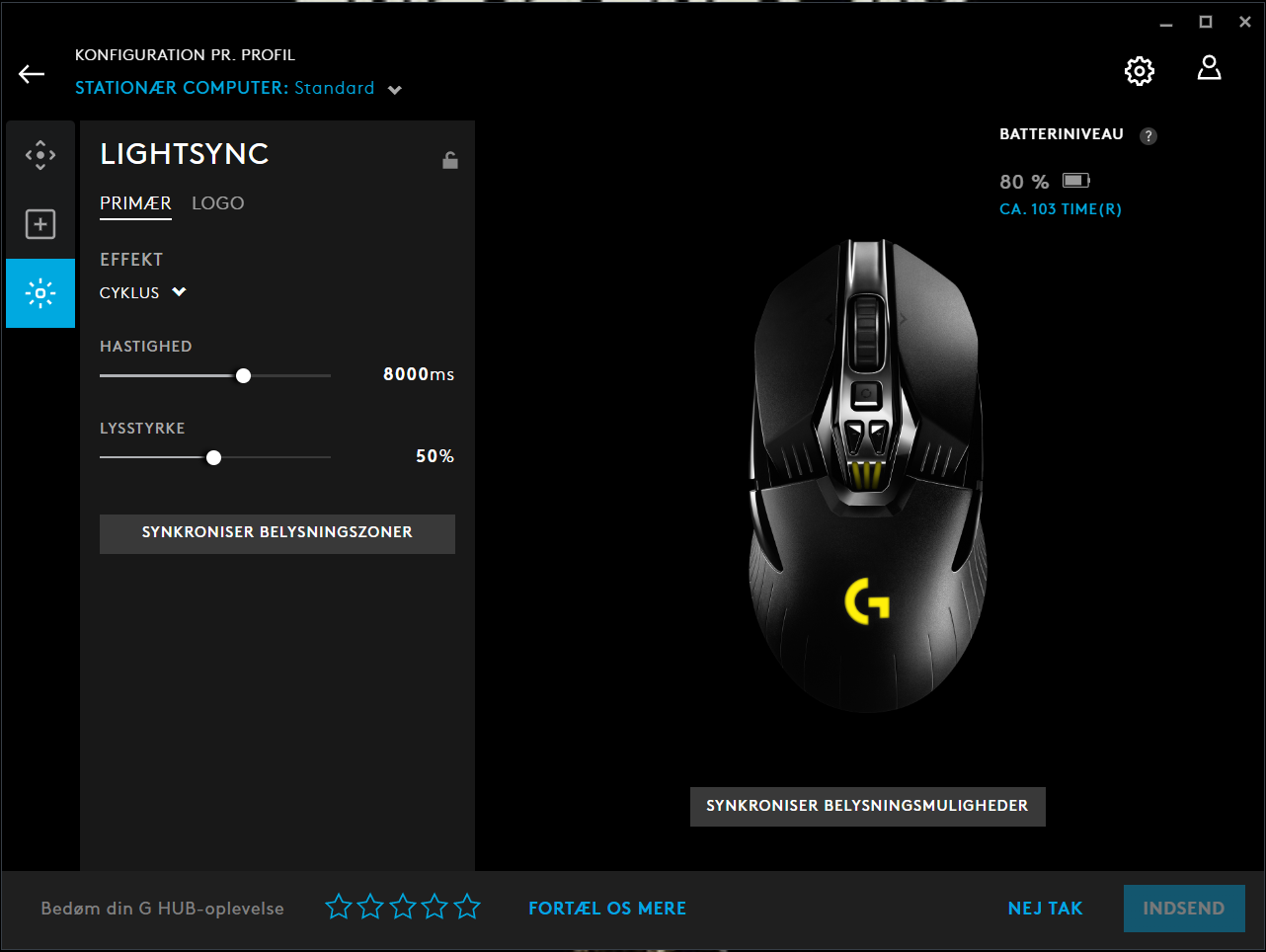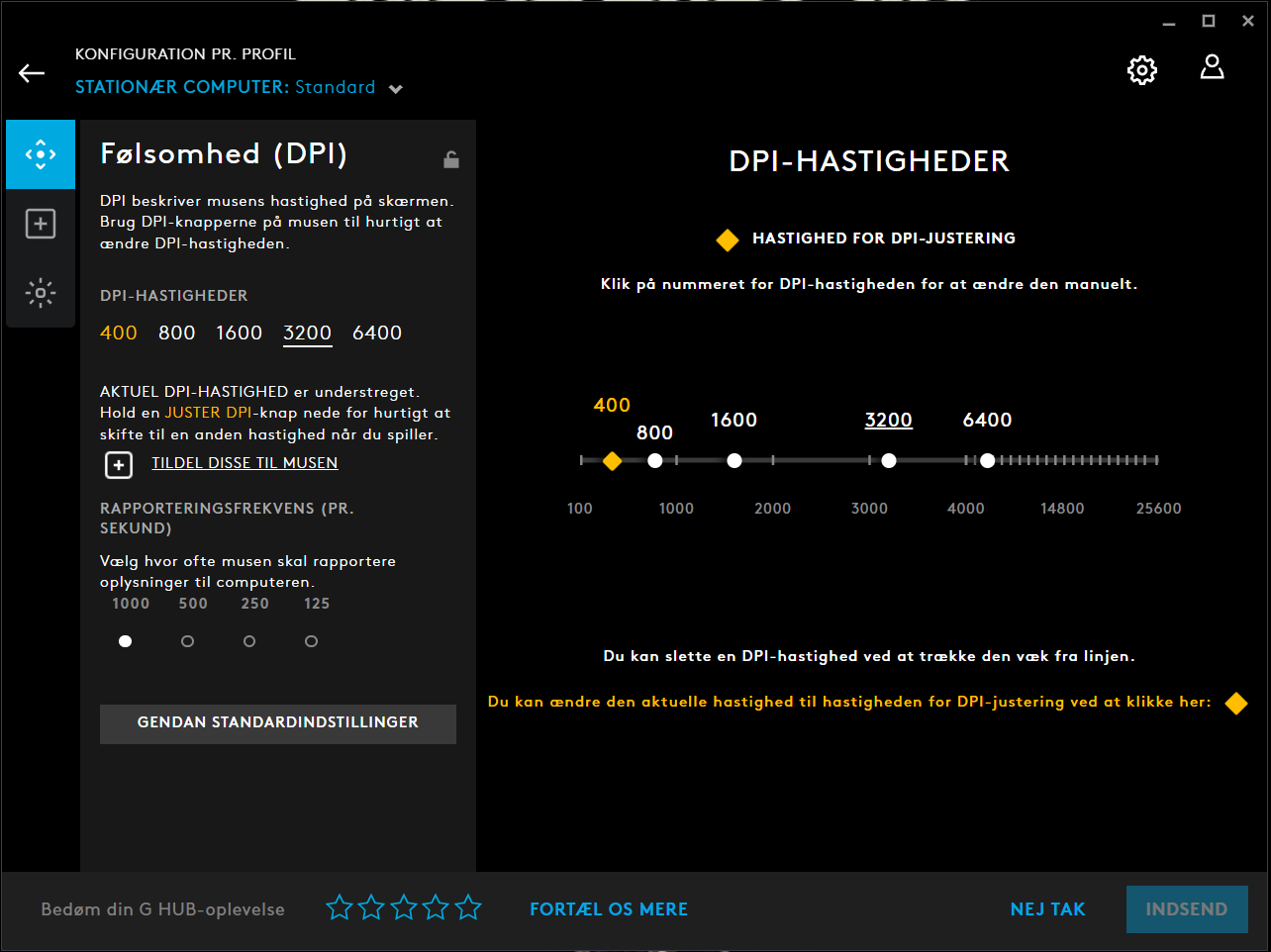 Når du har valgt din mus, i vores tilfælde G903 musen, kommer dette vindue frem. Her kan man vælge sine 5 DPI indstillinger samt ændre i rapporteringsfrekvensen fra 125 til 1000.