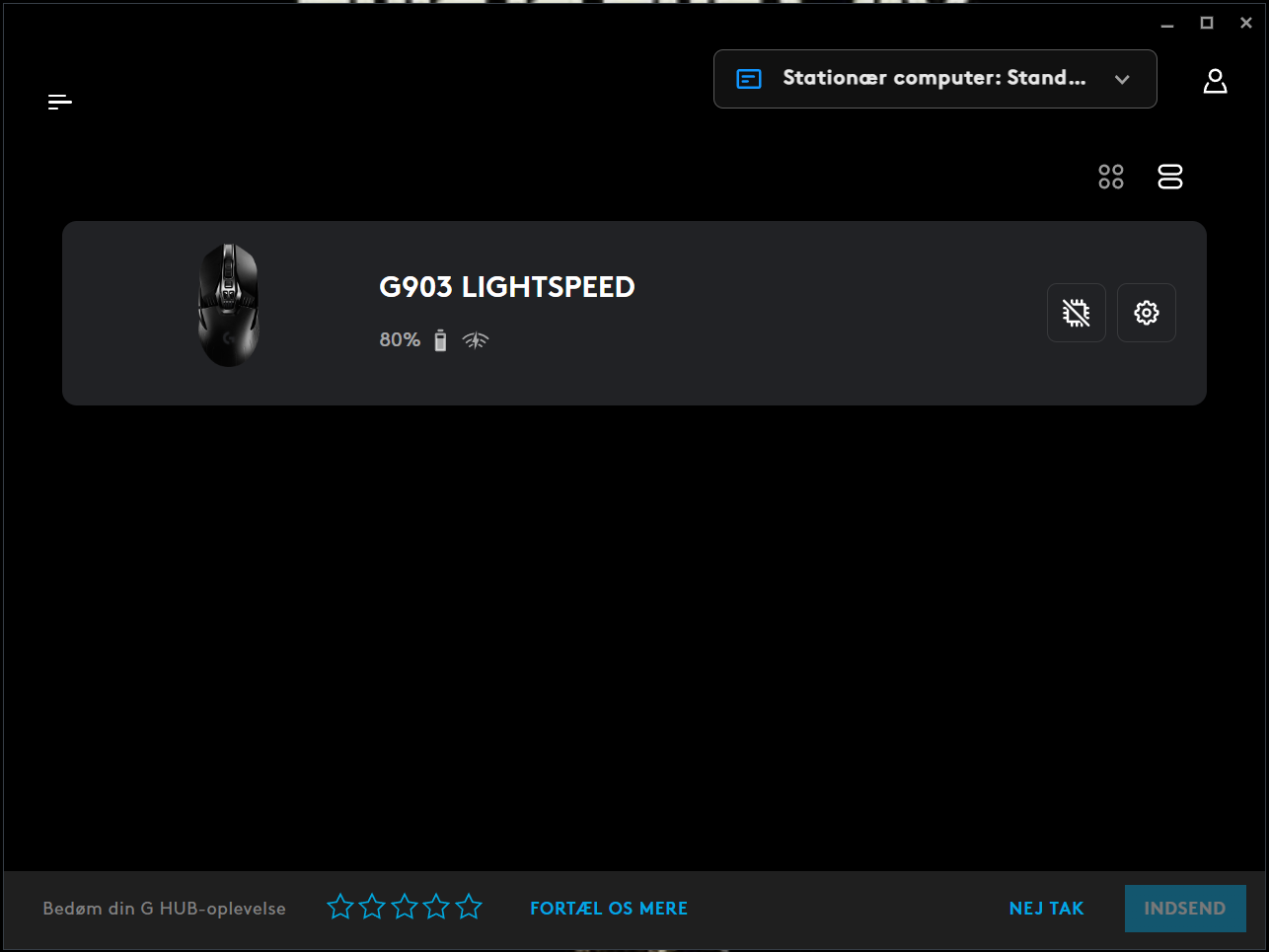 Logitech G Hub hentes nemt og simpelt inde på producentens hjemmeside og startsiden ser således ud. Her vælger man først hvilket Logitech produkt man vil ændre sine indstillinger for. Herover ses hvordan det ser ud hvis man kun har selve G903 musen.