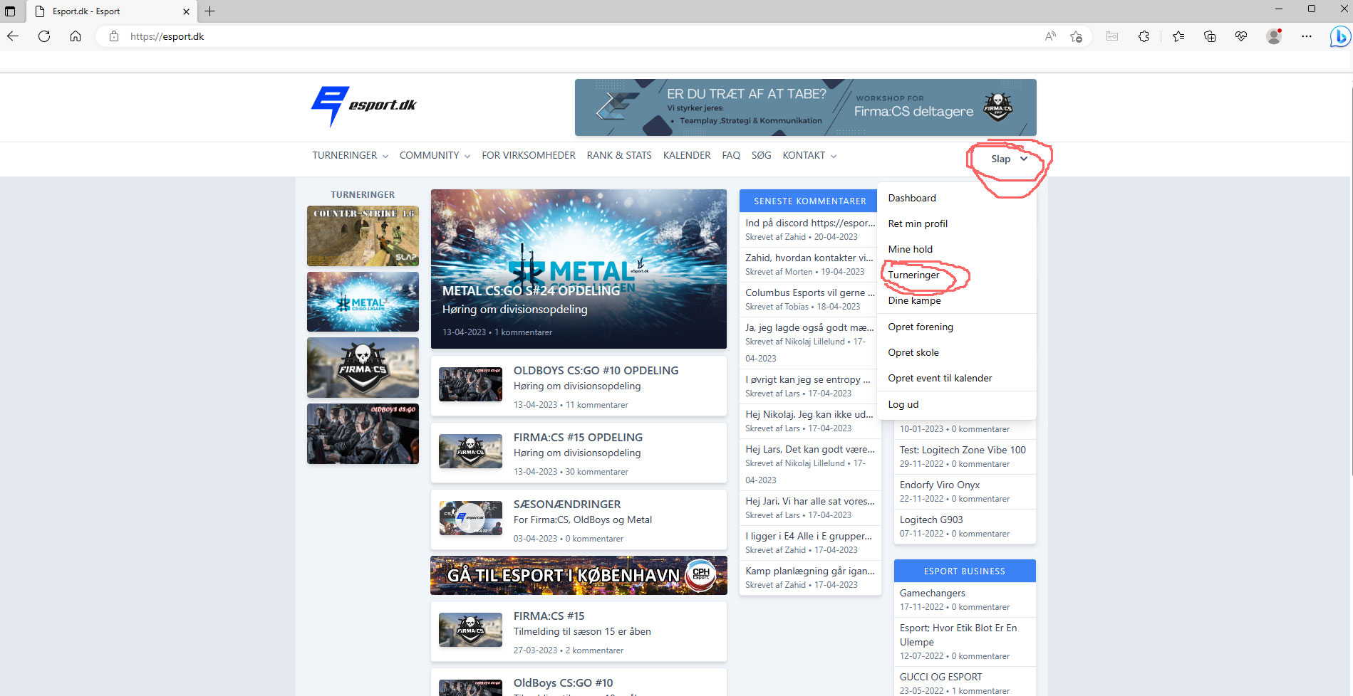 Så kommer der en undermenu. Her skal du vælge TURNERINGER