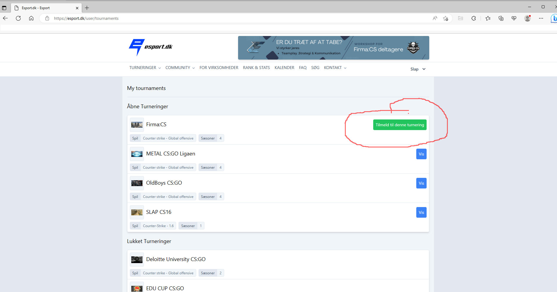 Dem som er åbne for tilmelding, vil du kunne se en stor knap ved hvor der står TILMELD TIL DENNE TURNERING.